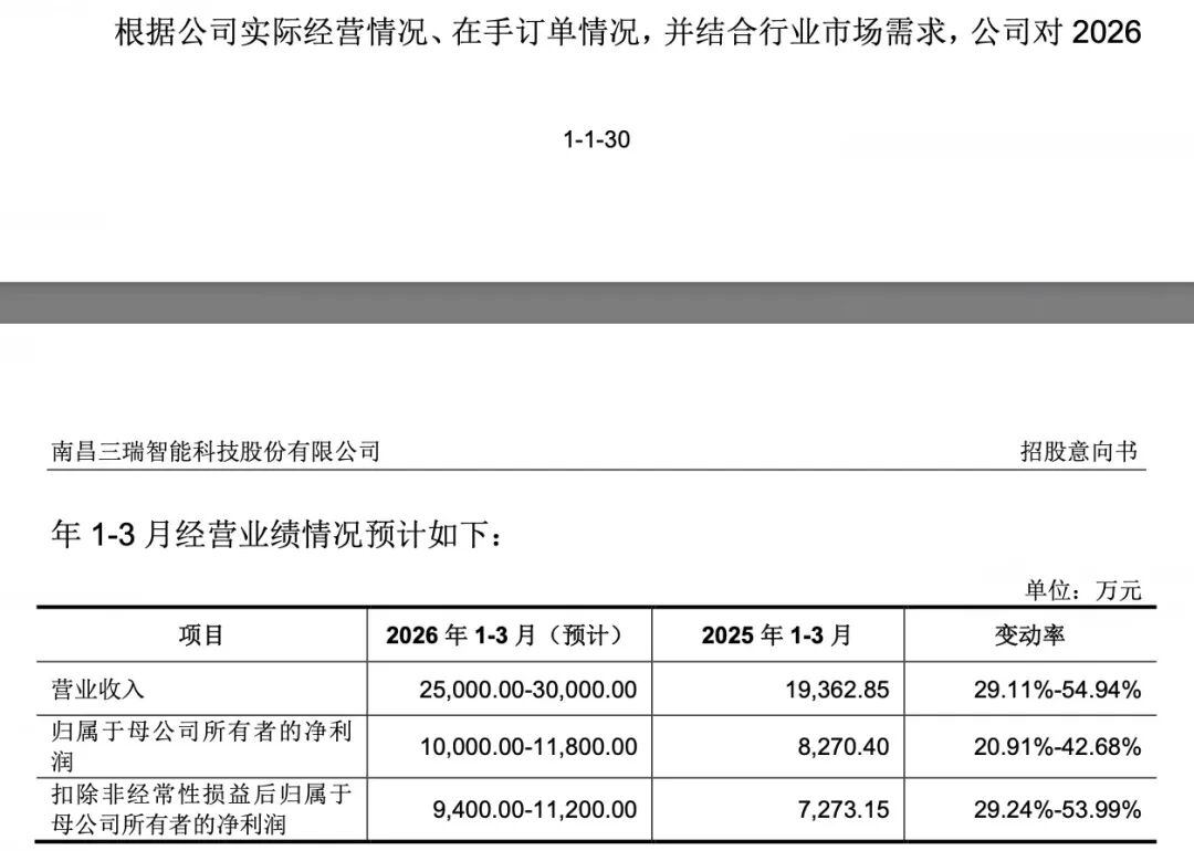 三瑞智能招股书称,预计公司2026年第一季度实现归属于母公司所有者的净利润1亿元至1.18亿元,同比增长20.91%至42.68%。