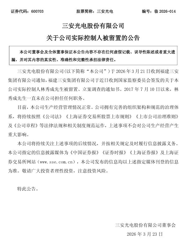 3月22日晚,三安光电发布公告称,公司于3月21日收到福建三安集团有限公司的通知,福建三安集团有限公司于近日收到国家监察委员会签发的关于公司实际控制人林秀成被留置、立案调查的通知书。