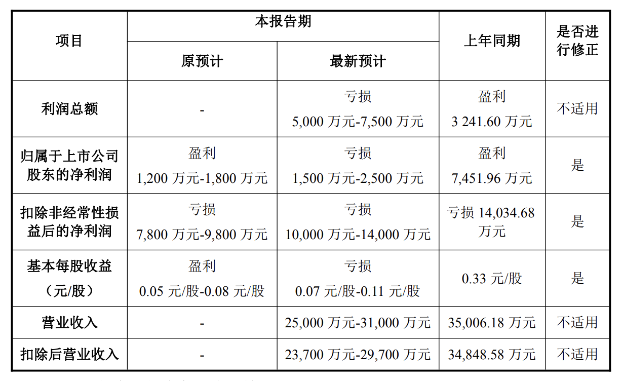 更正后,归母净利润约亏损1500万元至2500万元,扣除非经常性损益后的净利润预计亏损1亿元至1.4亿元,基本每股收益也修正为-0.07元/股—-0.11元/股。