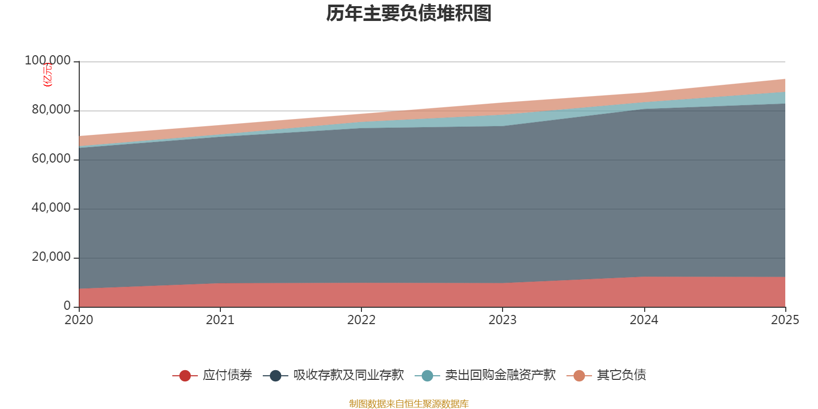 负债重大变化方面,截至2025年末,公司吸收存款及同业存款较上年末增加3.38%,占公司总资产比重下降1.95个百分点;卖出回购金融资产款较上年末增加71.76%,占公司总资产比重上升1.8个百分点;应付债券较上年末减少0.79%,占公司总资产比重下降0.85个百分点;向中央银行借款较上年末增加64.34%,占公司总资产比重上升0.71个百分点。