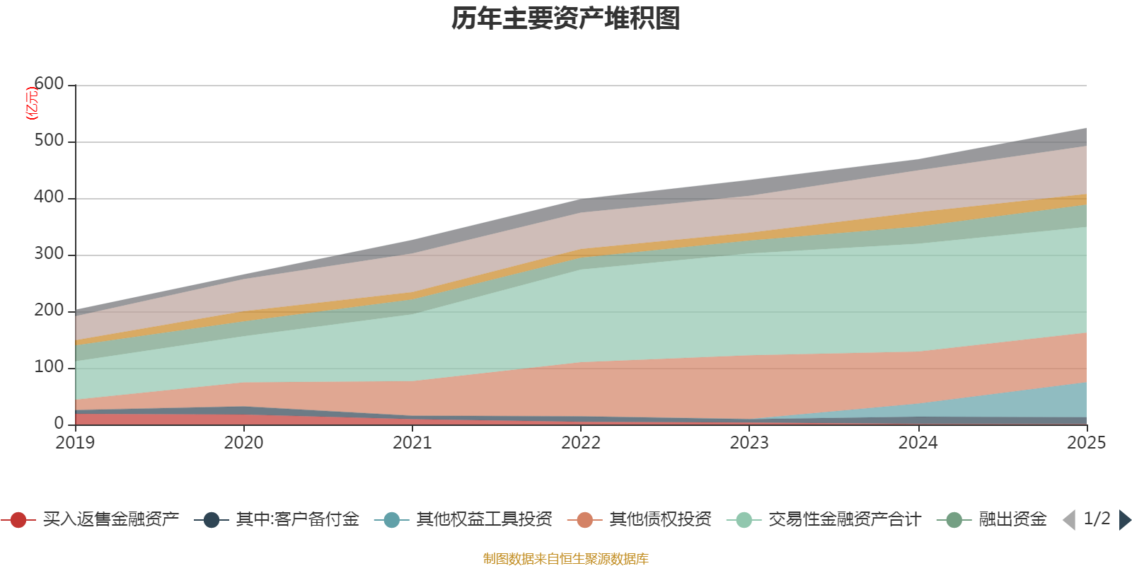 资产重大变化方面,截至2025年末,公司其他权益工具投资较上年末增加165.33%,占公司总资产比重上升6.84个百分点;交易性金融资产合计较上年末减少2%,占公司总资产比重下降5.01个百分点;其他债权投资较上年末减少4.8%,占公司总资产比重下降2.91个百分点;结算备付金较上年末减少25.47%,占公司总资产比重下降1.79个百分点。