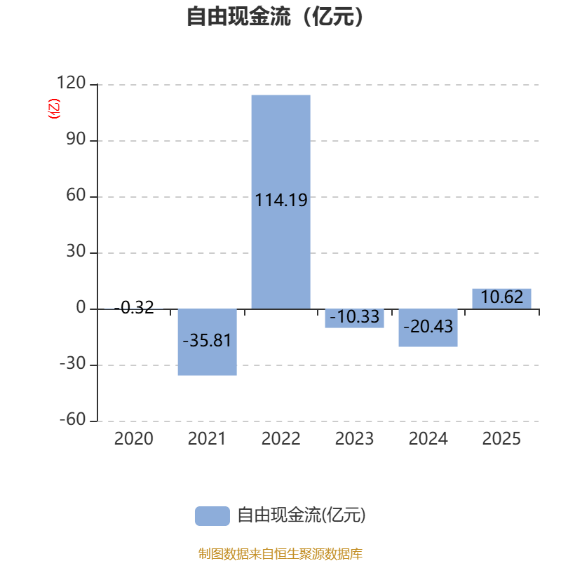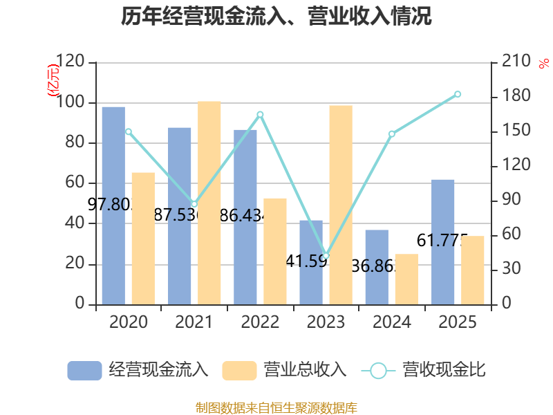 截至2025年,公司经营活动现金流净额为11.18亿元,同比增加23.94亿元;筹资活动现金流净额-5.98亿元,同比减少18.31亿元;投资活动现金流净额1.1亿元,上年同期为2.26亿元。