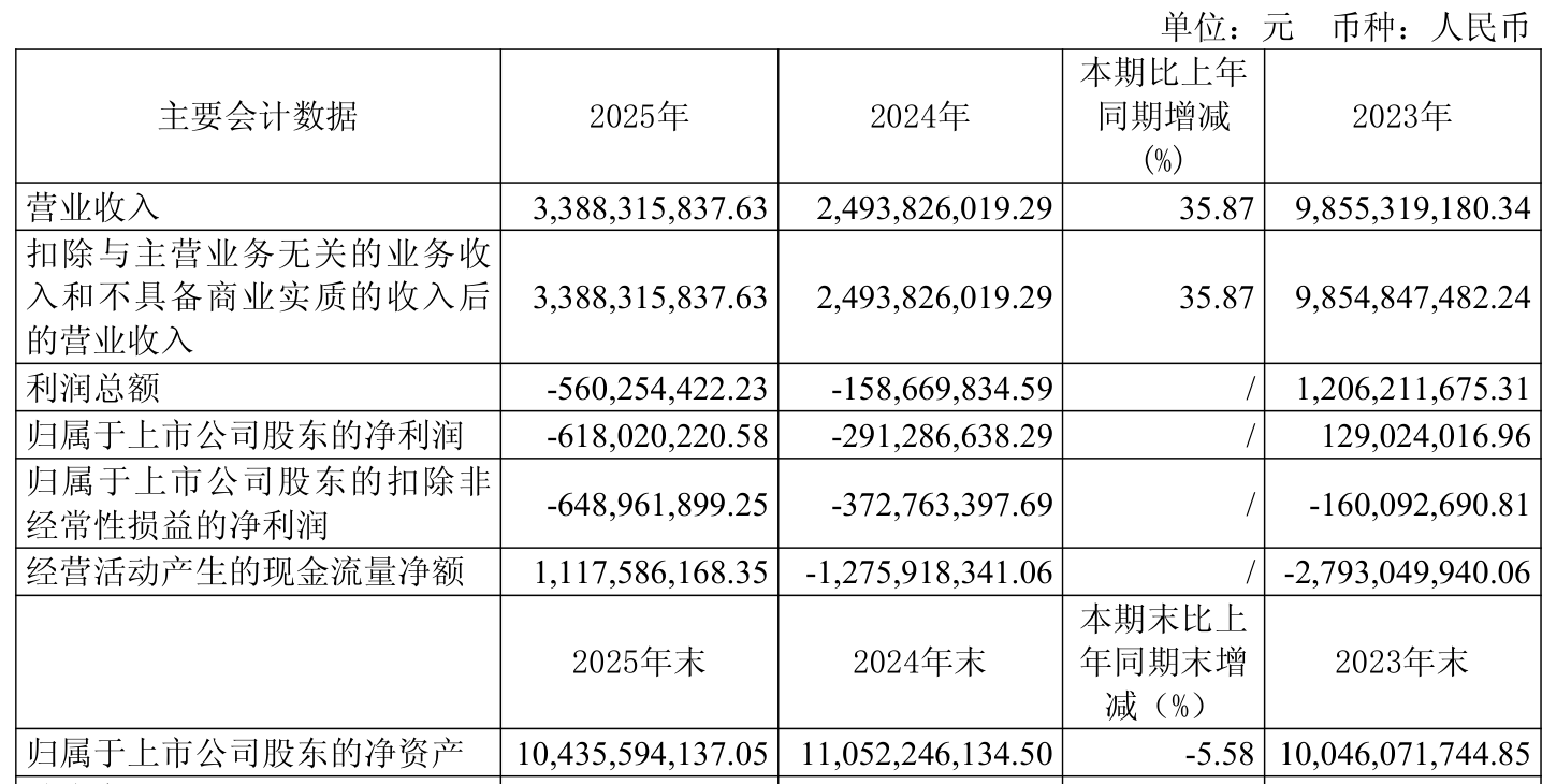 中证智能财讯上实发展(600748)3月21日披露2025年年度报告。2025年,公司实现营业总收入33.88亿元,同比增长35.87%;归母净利润亏损6.18亿元,上年同期亏损2.91亿元;扣非净利润亏损6.49亿元,上年同期亏损3.73亿元;经营活动产生的现金流量净额为11.18亿元,上年同期为-12.76亿元;报告期内,上实发展基本每股收益为-0.34元,加权平均净资产收益率为-5.75%。