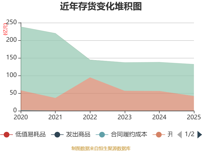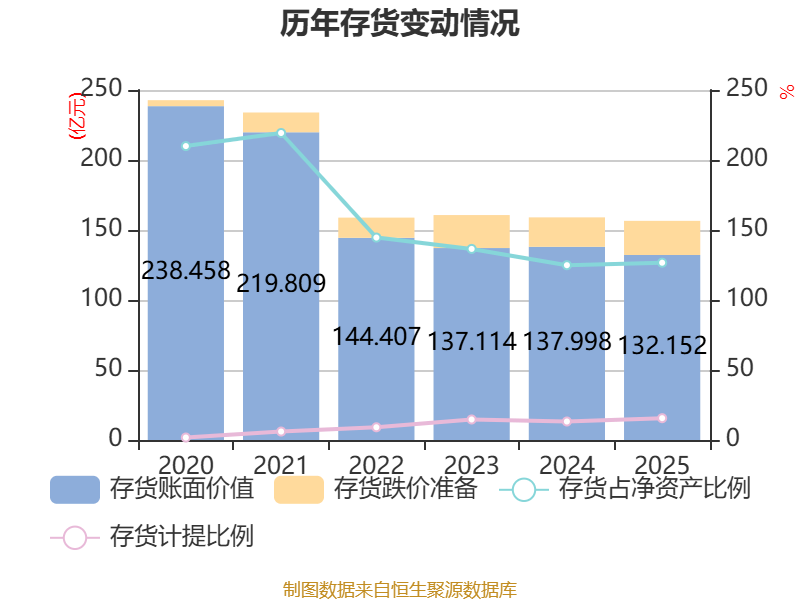 从存货变动来看,截至2025年末,公司存货账面价值为132.15亿元,占净资产的126.64%,较上年末减少5.85亿元。其中,存货跌价准备为24.39亿元,计提比例为15.58%。