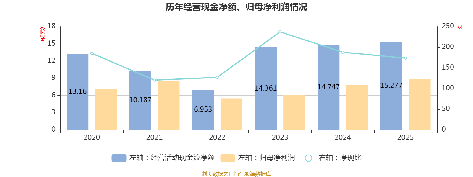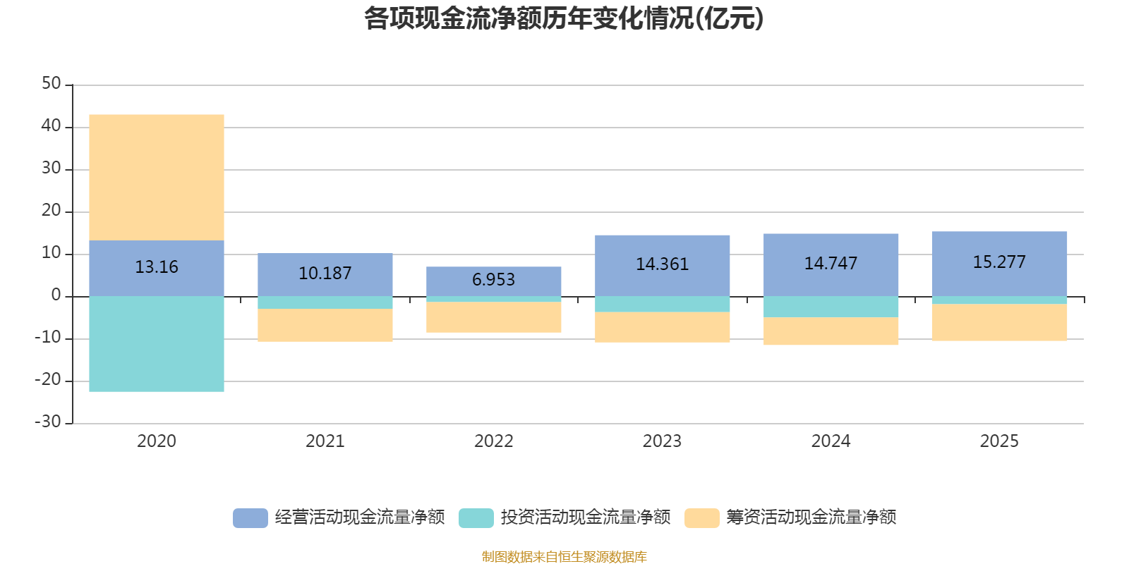 2025年,公司经营活动现金流净额为15.28亿元,同比增长3.59%;筹资活动现金流净额-8.66亿元,同比减少2.14亿元;投资活动现金流净额-1.91亿元,上年同期为-5.03亿元。