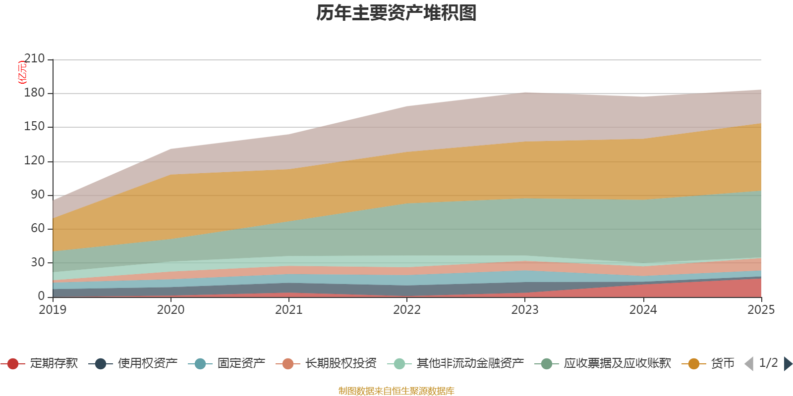资产重大变化方面,截至2025年末,公司定期存款较上期末增加47.79%,占公司总资产比重上升2.67个百分点;货币资金较上期末增加10.73%,占公司总资产比重上升2.12个百分点;其他非流动金融资产较上期末减少78.7%,占公司总资产比重下降1.41个百分点;长期股权投资较上期末增加30.23%,占公司总资产比重上升1.23个百分点。