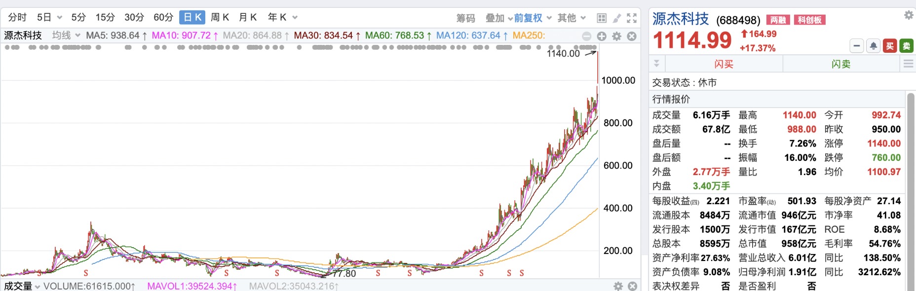 其中,3月20日,源杰科技飙涨17.37%,股价也因此站上千元大关创历史新高,成为科创板继寒武纪后第二只千元股,同时也是A股历史上第8只千元股。