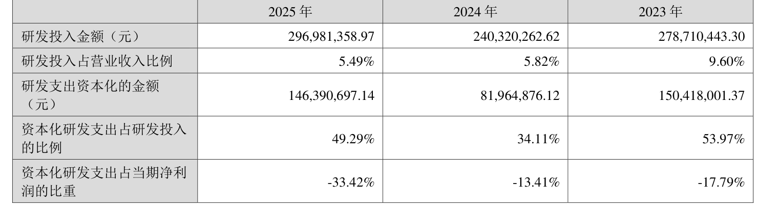 2025年全年,公司研发投入金额为2.97亿元,同比增长23.58%;研发投入占营业收入比例为5.49%,相比上年同期下降0.33个百分点。此外,公司全年研发投入资本化率为49.29%。
