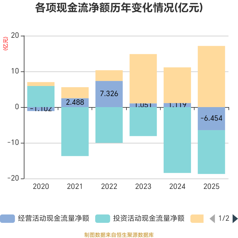 截至2025年,公司经营活动现金流净额为-6.45亿元,同比减少7.57亿元;筹资活动现金流净额17.13亿元,同比增加7.12亿元;投资活动现金流净额-12.27亿元,上年同期为-18.44亿元。