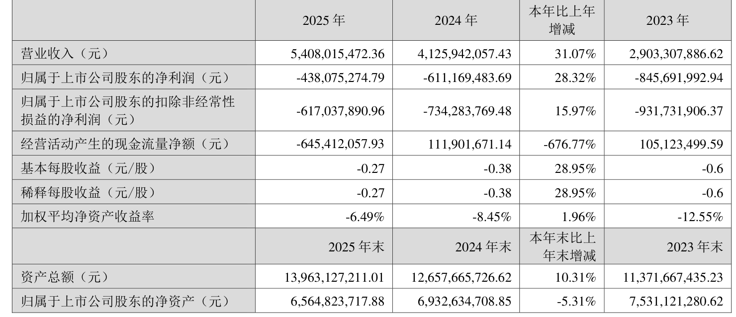 中证智能财讯华灿光电(300323)3月23日披露2025年年度报告。2025年,公司实现营业总收入54.08亿元,同比增长31.07%;归母净利润亏损4.38亿元,上年同期亏损6.11亿元;扣非净利润亏损6.17亿元,上年同期亏损7.34亿元;经营活动产生的现金流量净额为-6.45亿元,上年同期为1.12亿元;报告期内,华灿光电基本每股收益为-0.27元,加权平均净资产收益率为-6.49%。