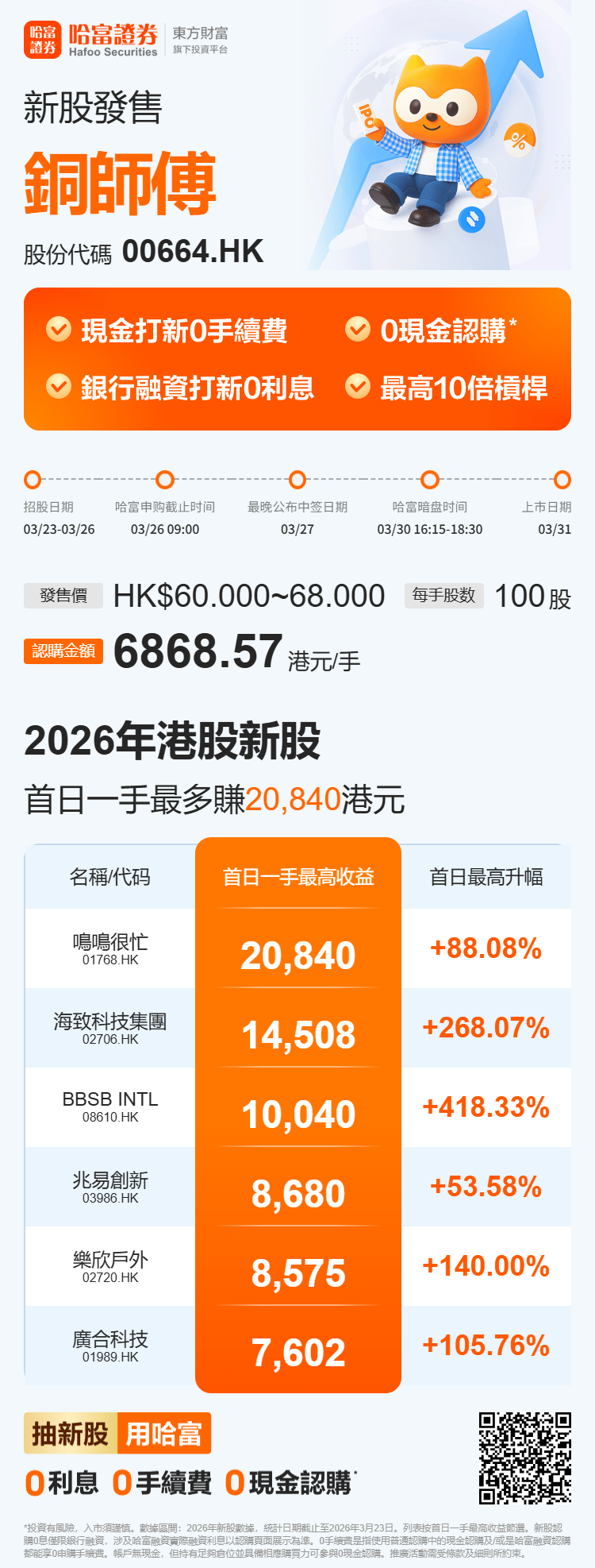 铜师傅(00664.HK)发布公告,于3月23日-3月26日招股,公司拟全球发售约740.68万股股份,预期将于3月31日上市。