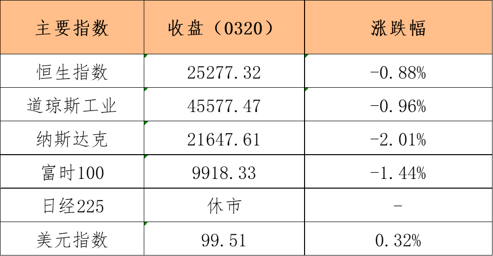 美股市场:截止3月20日收盘,美股三大指数全线下跌。上周五,美国通胀忧虑进一步发酵,市场基本排除美联储年内降息可能,甚至开始对潜在的加息行动进行定价。受这一系列因素影响,美股三大指数均连跌四周,其中标普和纳指双双收于2025年9月以来的最低水平。