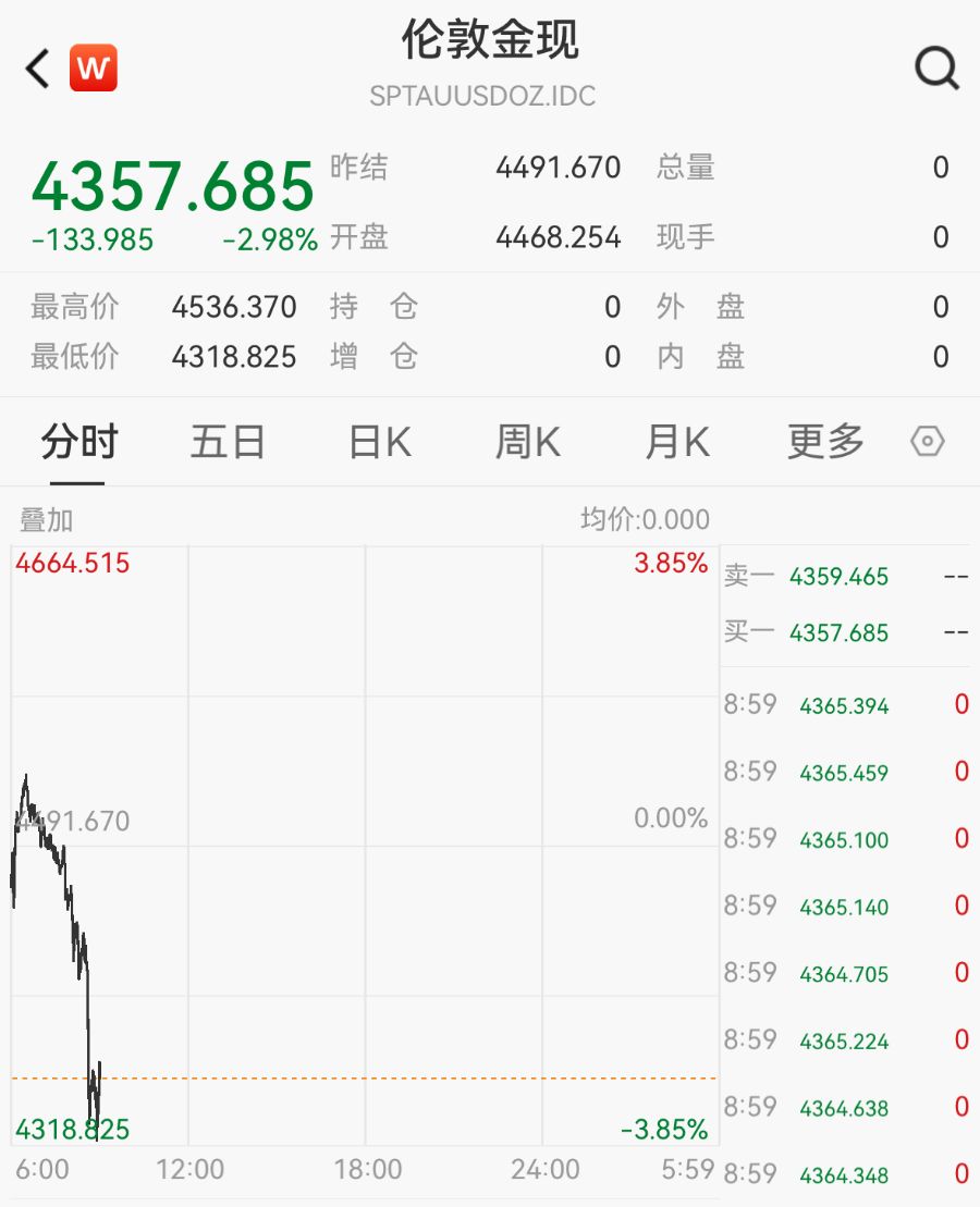 北京时间3月23日,现货黄金日内一度跌超3%,逼近4300美元,截至8:59,报4357美元/盎司,跌2.98%。