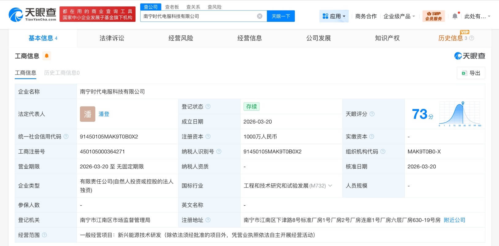南方财经3月23日电,天眼查工商信息显示,近日,南宁时代电服科技有限公司成立,法定代表人为潘登,注册资本1000万人民币,经营范围为新兴能源技术研发。股东信息显示,该公司由宁德时代(300750)旗下时代电服科技有限公司全资持股。