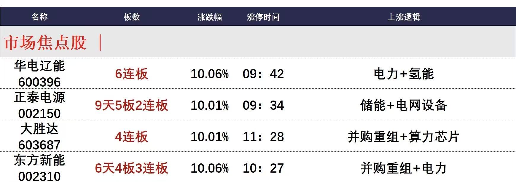 今日午盘全市场共28股涨停,连板股总数5只,10股封板未遂,封板率为74%(不含ST股、退市股)。焦点股方面,电力板块反复活跃,华电辽能6连板、东方新能6天4板。此外,并购重组的大胜达4连板,储能概念股正泰电源9天5板。