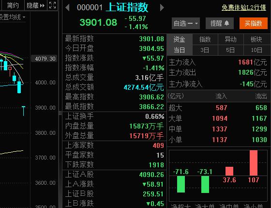 截至发稿,上证指数收复3900点,报3901.08点,跌幅收窄至1.41%。全市场飘红个股增至915只。