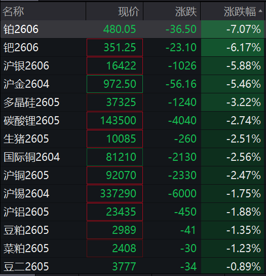 铂跌超7%,钯跌超6%,沪银、沪金均跌超5%,碳酸锂跌超4%。
