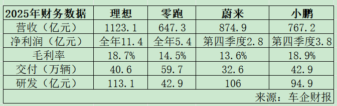 2025年全年,理想面临增程市场增长乏力、转型纯电市场成效不显著,以及召回事件等多重不利因素影响,但仍以11.4亿元的净利润,排名造车新势力首位。