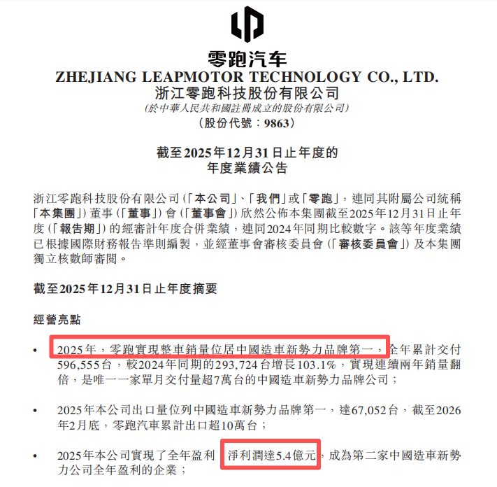 零跑拿下造车新势力2025年全年销冠,但同期净利润为5.4亿元,排名造车新势力第二位。