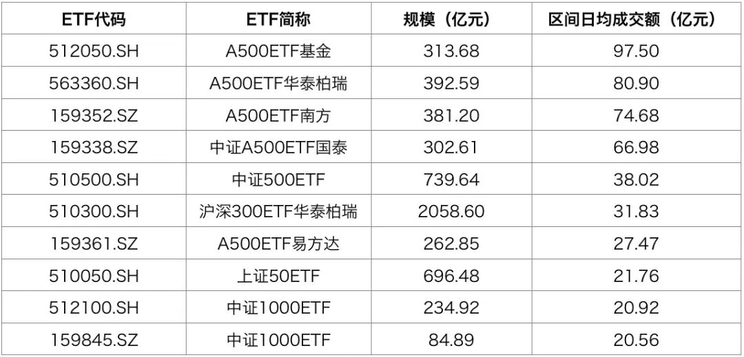 上周中盘宽基产品成交活跃,A500ETF南方(159352)、中证500ETF(510500)、中证1000ETF(512100)流动性领先。