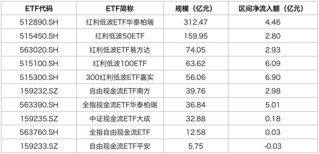 红利/现金流类产品筑资产“避风港”,红利低波50ETF(515450)、自由现金流ETF南方(159232)等获得较大资金净流入。