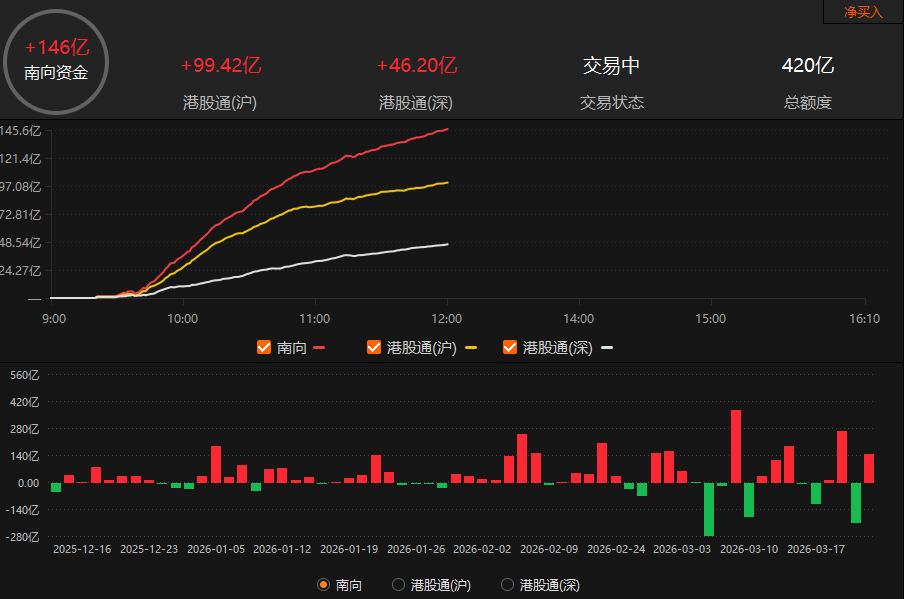 南向资金早盘“爆买”,净买入额达146亿港元,沪港通、深港通分别净买入99.42亿港元和46.20亿港元。