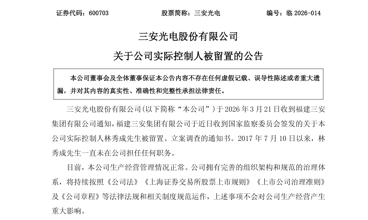公告称,公司于2026年3月21日收到福建三安集团有限公司通知,福建三安集团有限公司于近日收到国家监察委员会签发的关于公司实际控制人林秀成被留置、立案调查的通知书。
