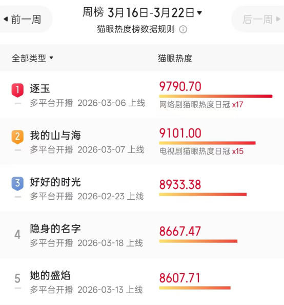 猫眼最新数据显示,《逐玉》已连续三周位居全网网剧热度榜第一名。