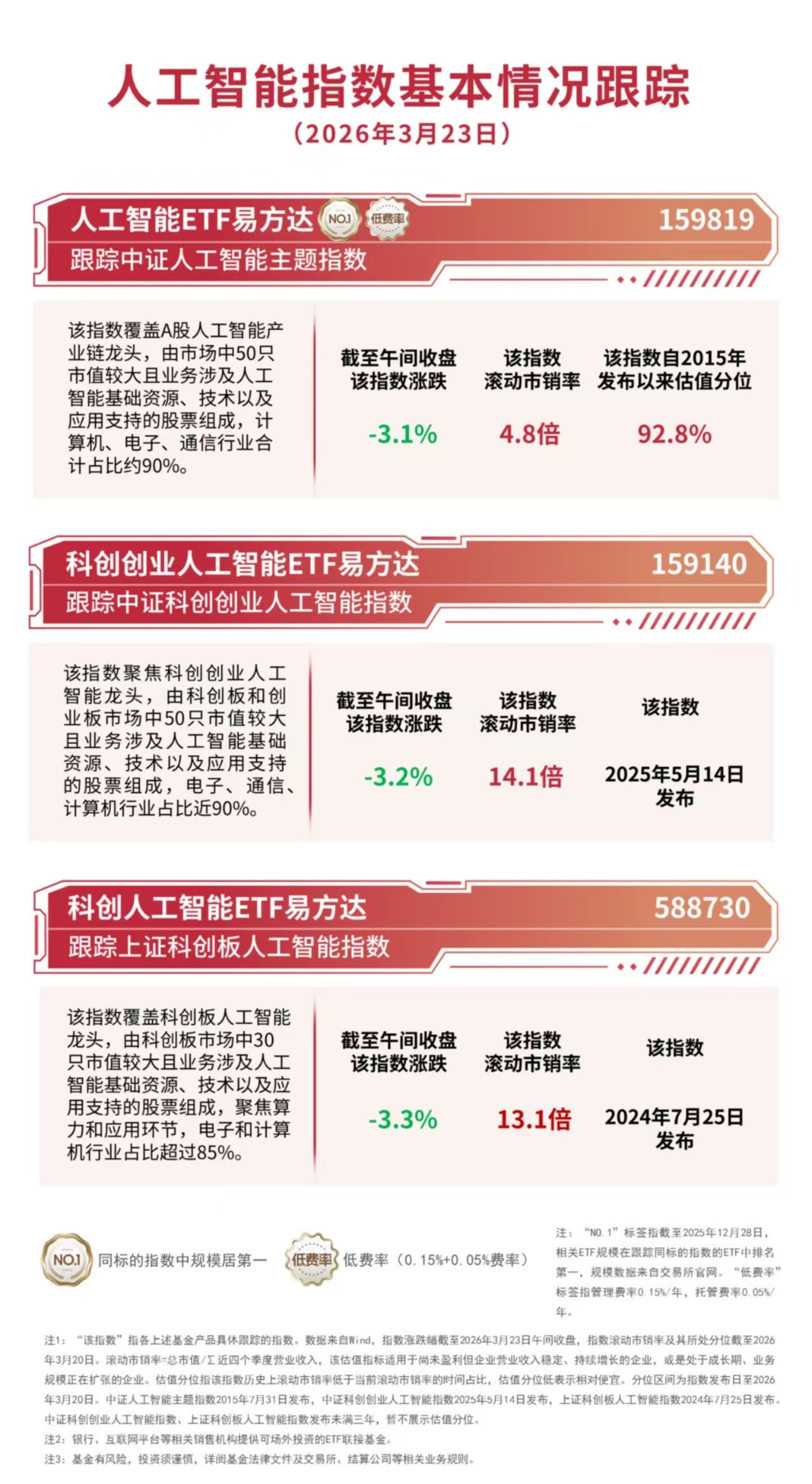 截至午间收盘,中证人工智能主题指数下跌3.1%,中证科创创业人工智能指数下跌3.2%,上证科创板人工智能指数下跌3.3%。资金逆势布局,人工智能ETF易方达(159819,联接A/C:012733/012734)半日净申购达1200万份。