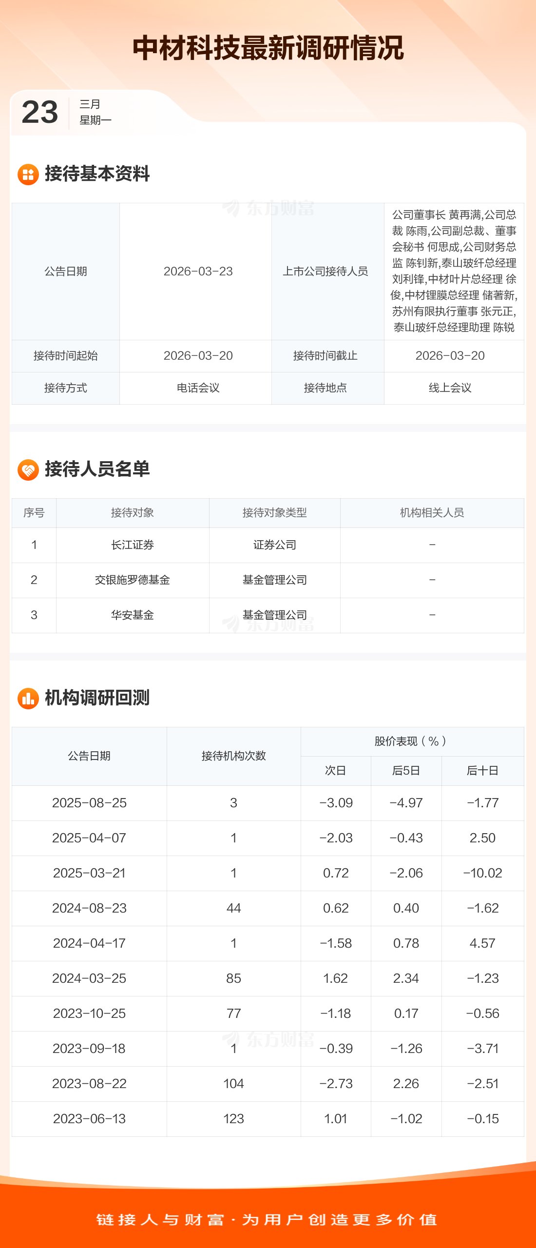 中材科技3月23日公告称,3月20日接待长江证券等3家机构调研。接待人员包括公司董事长 黄再满,公司总裁 陈雨,公司副总裁、董事会秘书 何思成,公司财务总监 陈钊新,泰山玻纤总经理 刘利锋,中材叶片总经理 徐俊,中材锂膜总经理 储著新,苏州有限执行董事 张元正,泰山玻纤总经理助理 陈锐。