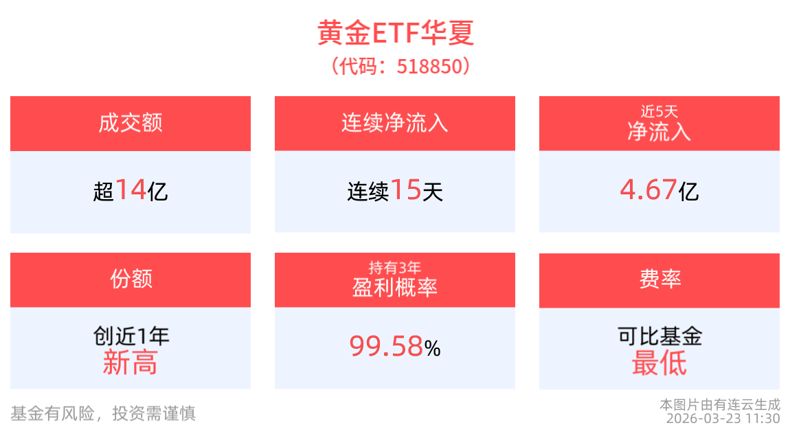 统计显示,虽然3月来金价连续走低,黄金ETF华夏连续获资金布局,截至3月20日,黄金ETF华夏(518850)最新份额达17.87亿份,创成立以来新高,近15天获得连续资金净流入,合计“吸金”13.66亿元。