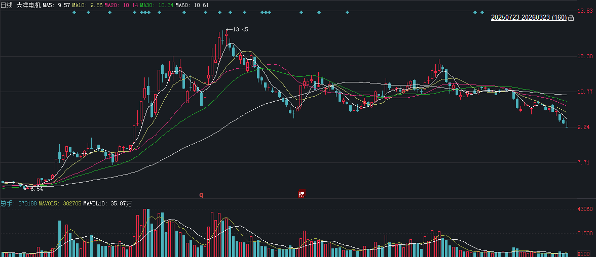二级市场上,大洋电机近两个月股价持续承压,累计跌幅已超过23%。截至3月23日13点50分,公司股价下跌2.13%报9.17元/股,相较于2025年10月的阶段性高点,已累计下跌近三成。