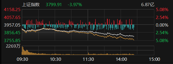 上证报中国证券网讯 3月23日,沪指盘中跌破3800点。截至14时23分,沪指跌3.97%,报3799.91点。