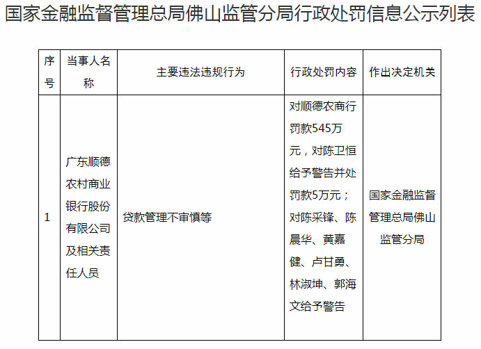 其中,因贷款管理不审慎等,佛山金融监管分局对顺德农商行处以545万元罚款,还同步追究了相关责任人的责任。陈卫恒被给予警告并处罚款5万元;陈采锋、陈晨华、黄嘉健、卢甘勇、林淑坤、郭海文6名相关责任人被给予警告。