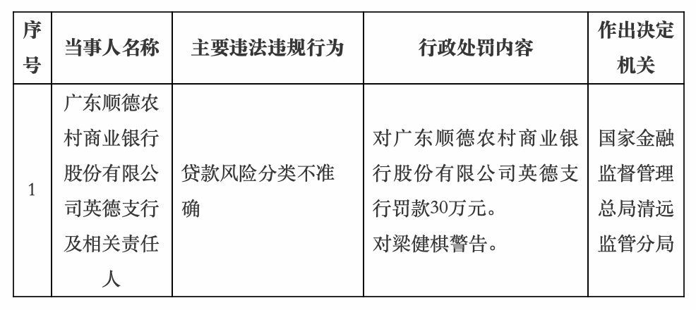 其英德支行亦因贷款风险分类不准确被罚30万元,梁健棋被予以警告。