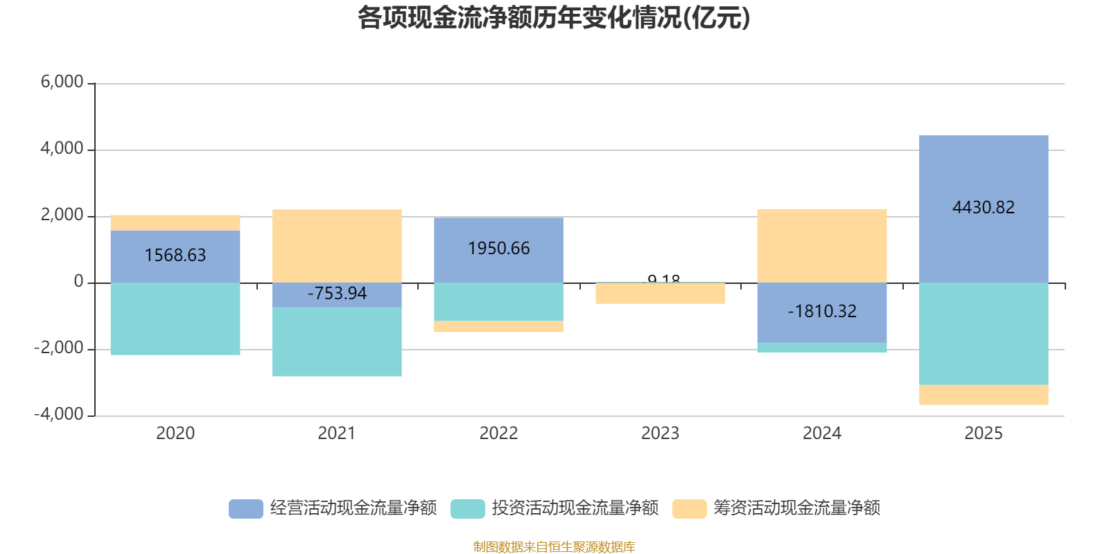 2025年,公司经营活动现金流净额为4430.82亿元,同比增加6241.14亿元;筹资活动现金流净额-597.92亿元,同比减少2805.95亿元;投资活动现金流净额-3080.85亿元,上年同期为-295.32亿元。