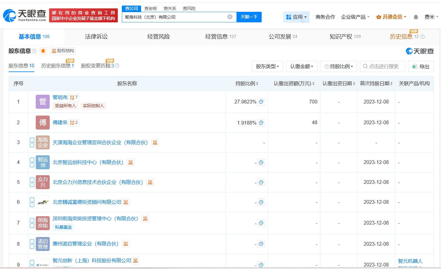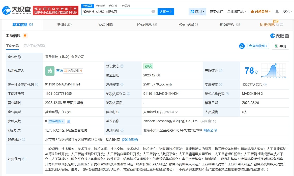 智身科技(北京)有限公司成立于2023年12月,法定代表人为黄坤,股东信息显示,该公司现由管明尧、智元机器人关联公司智元创新(上海)科技股份有限公司及上述新增股东等共同持股。公开资料显示,该公司聚焦具身智能机器人的产业化落地。