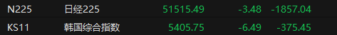 3月23日,日韩股市收盘齐跌,日经225指数收跌3.48%,报51515.49点;韩国综合指数收跌6.49%,报5405.75点。