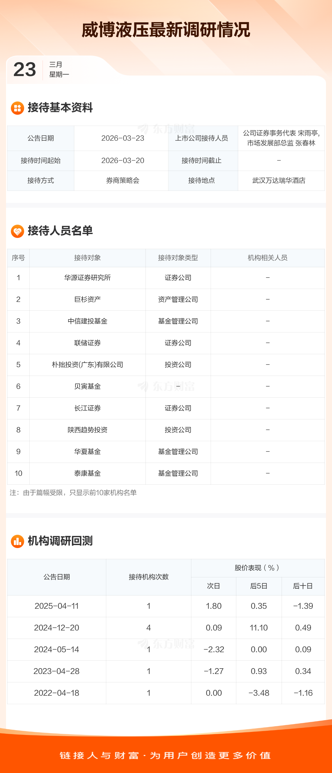 威博液压3月23日公告称,3月20日接待华源证券研究所等14家机构调研。接待人员包括公司证券事务代表 宋雨亭,市场发展部总监 张春林。
