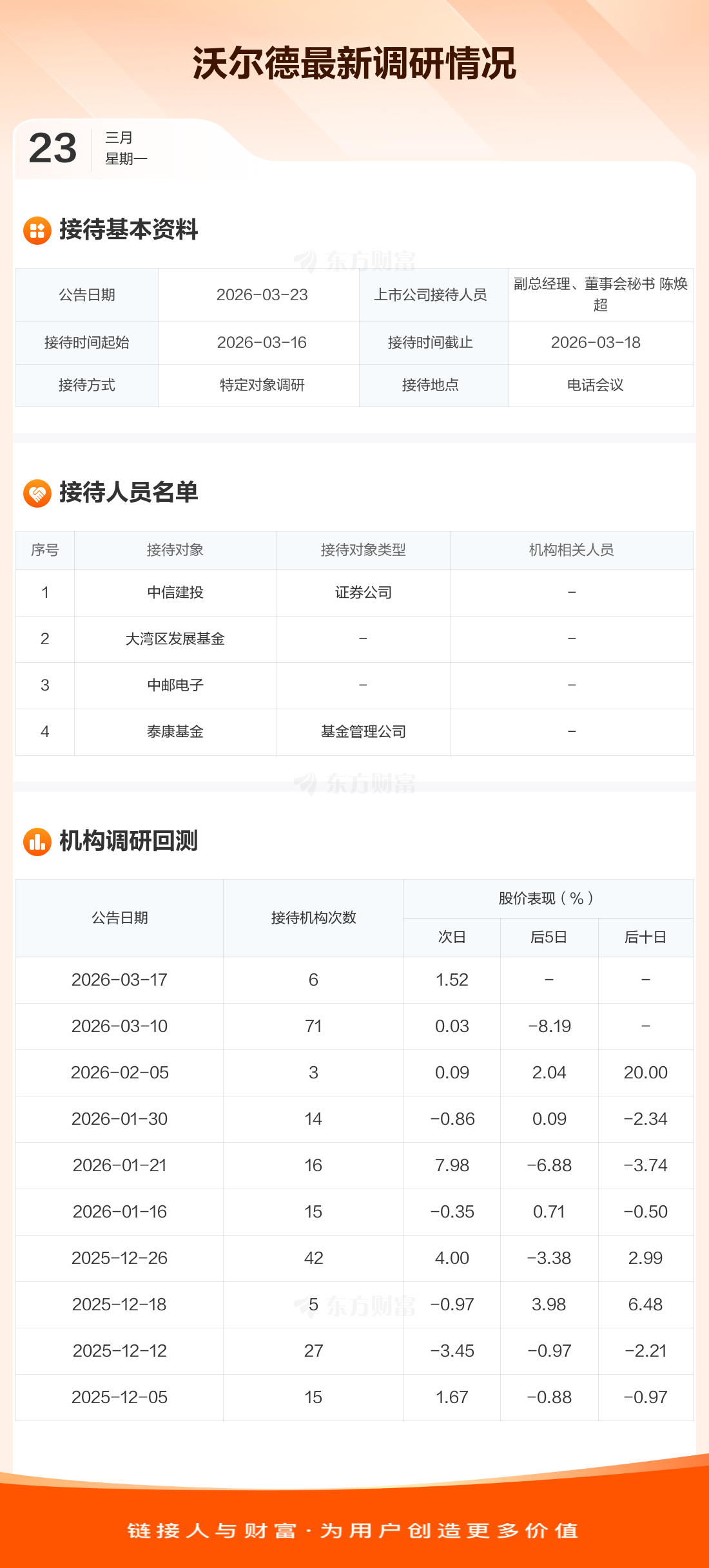 沃尔德3月23日公告称,3月16日至3月18日接待中信建投等4家机构调研。接待人员包括副总经理、董事会秘书 陈焕超。