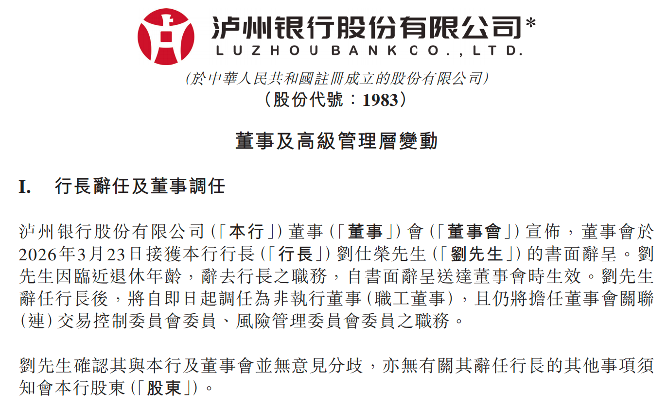 泸州银行:行长刘仕荣因临近退休年龄辞职