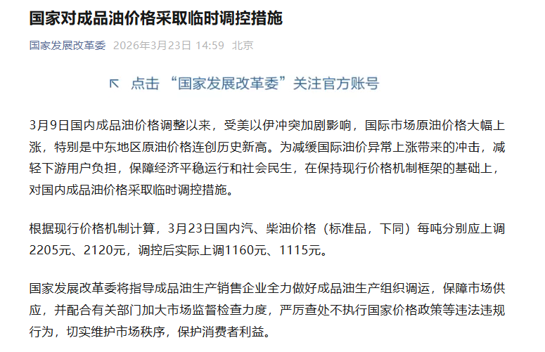 国家发展改革委3月23日发布消息,3月9日国内成品油价格调整以来,受美以伊冲突加剧影响,国际市场原油价格大幅上涨。为减缓国际油价异常上涨带来的冲击,减轻下游用户负担,保障经济平稳运行和社会民生,在保持现行价格机制框架的基础上,对国内成品油价格采取临时调控措施。
