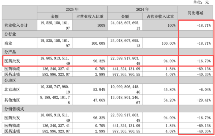 分业务板块看,公司的颓势几乎无死角。占营收比重高达96.32%的医药批发业务收入同比下降16.79%,成为拖累整体表现的主因。而医药物流和医药连锁两大业务更是遭遇“断崖式”下跌,收入分别锐减69.13%和40.35%。