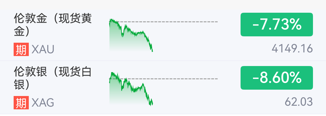 截至发稿,伦敦金下跌7.73%,报4149.16美元/盎司;伦敦银下跌8.6%,报62.03美元/盎司。
