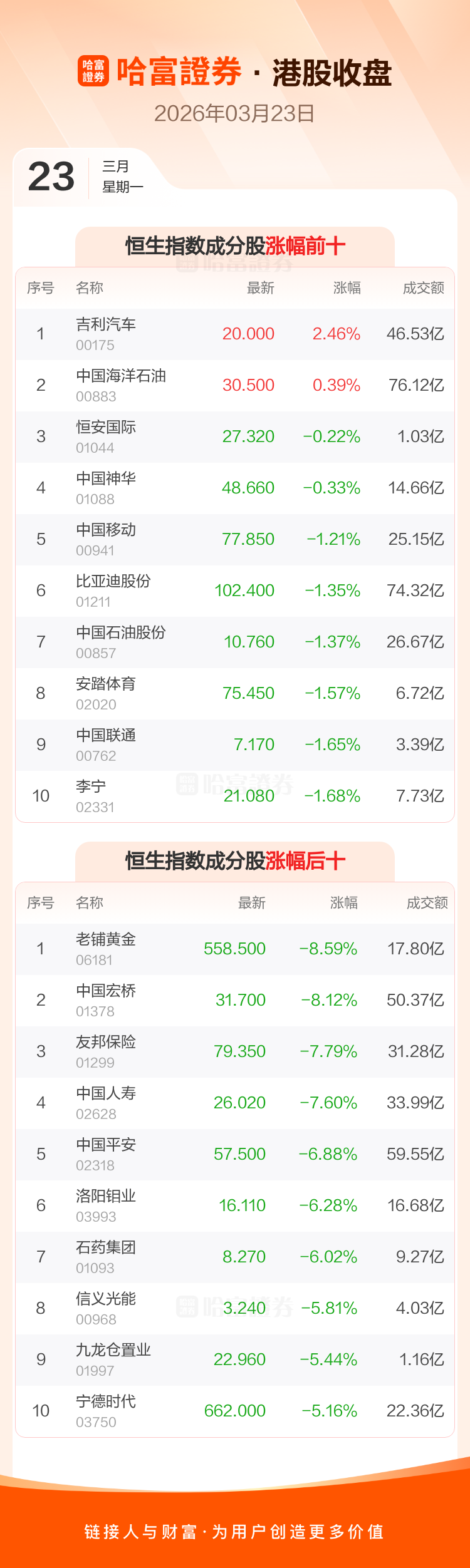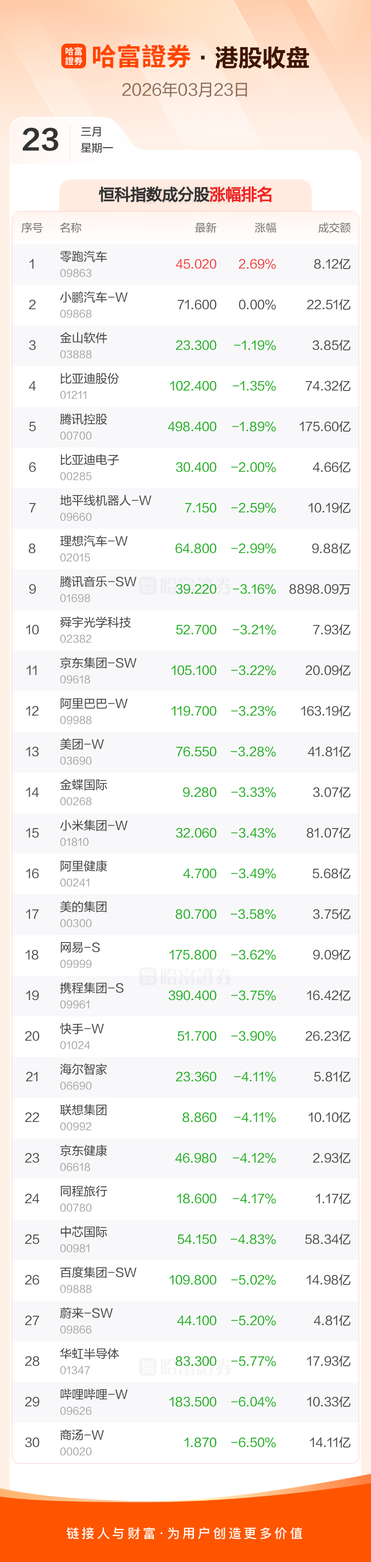 港股3月23日收盘走低 ,恒生指数收报24382.47点,跌894.85点,跌幅3.54%;恒生科技指数收报4712.48点,跌159.9点,跌幅3.28%。恒生指数成分股中吉利汽车、中国海洋石油涨幅居前,老铺黄金、中国宏桥、友邦保险跌幅靠前。恒生科技指数成分股中零跑汽车涨幅居前,商汤-W、哔哩哔哩-W、华虹半导体跌幅靠前。