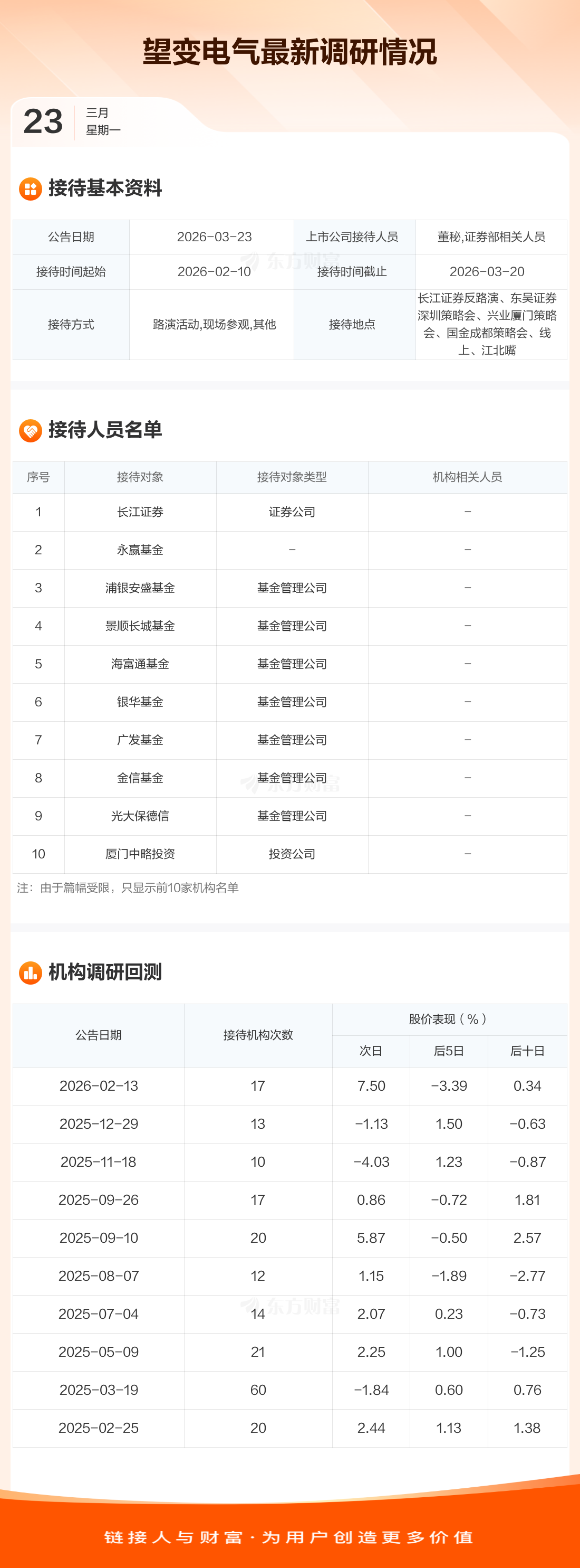 望变电气3月23日公告称,2月10日至3月20日接待长江证券等47家机构调研。接待人员包括董秘,证券部相关人员。