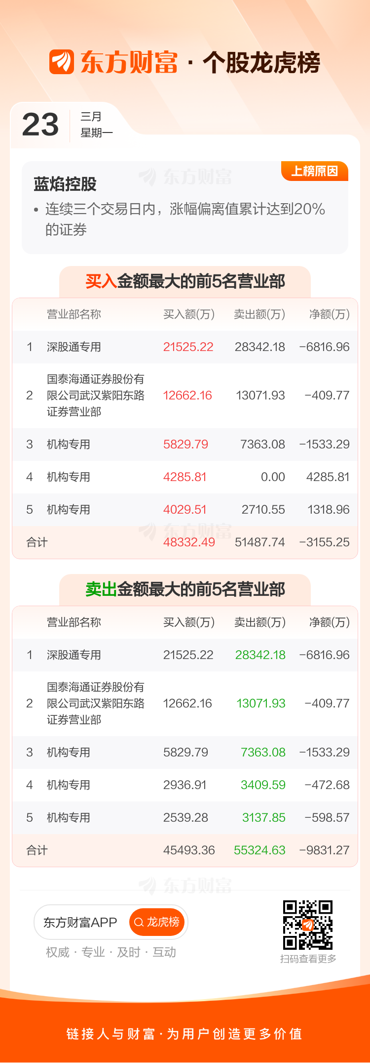 蓝焰控股(000968)龙虎榜数据(03-23)
