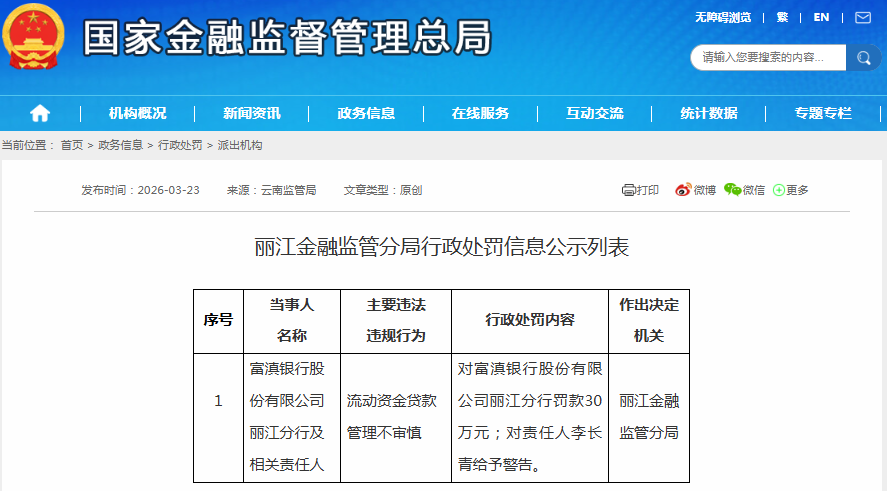 3月23日,据国家金融监管局云南监管分局消息,因流动资金贷款管理不审慎,富滇银行股份有限公司丽江分行被罚款30万元,责任人李长青被给予警告。