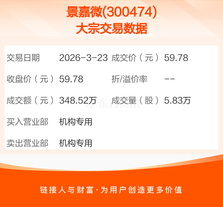 2026年3月23日,景嘉微发生1笔大宗交易,共成交5.83万股,成交金额348.52万元,占其流通市值比例为0.01%。
