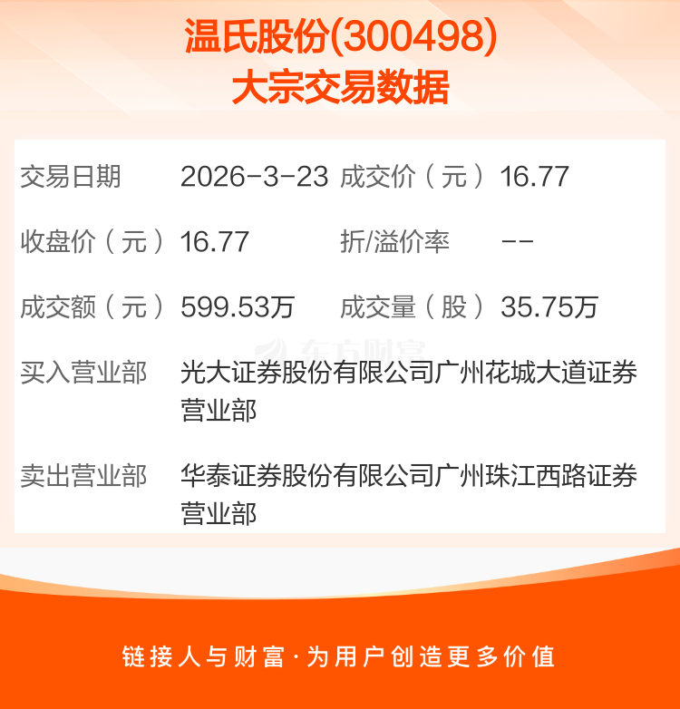 2026年3月23日,温氏股份发生1笔大宗交易,共成交35.75万股,成交金额599.53万元。